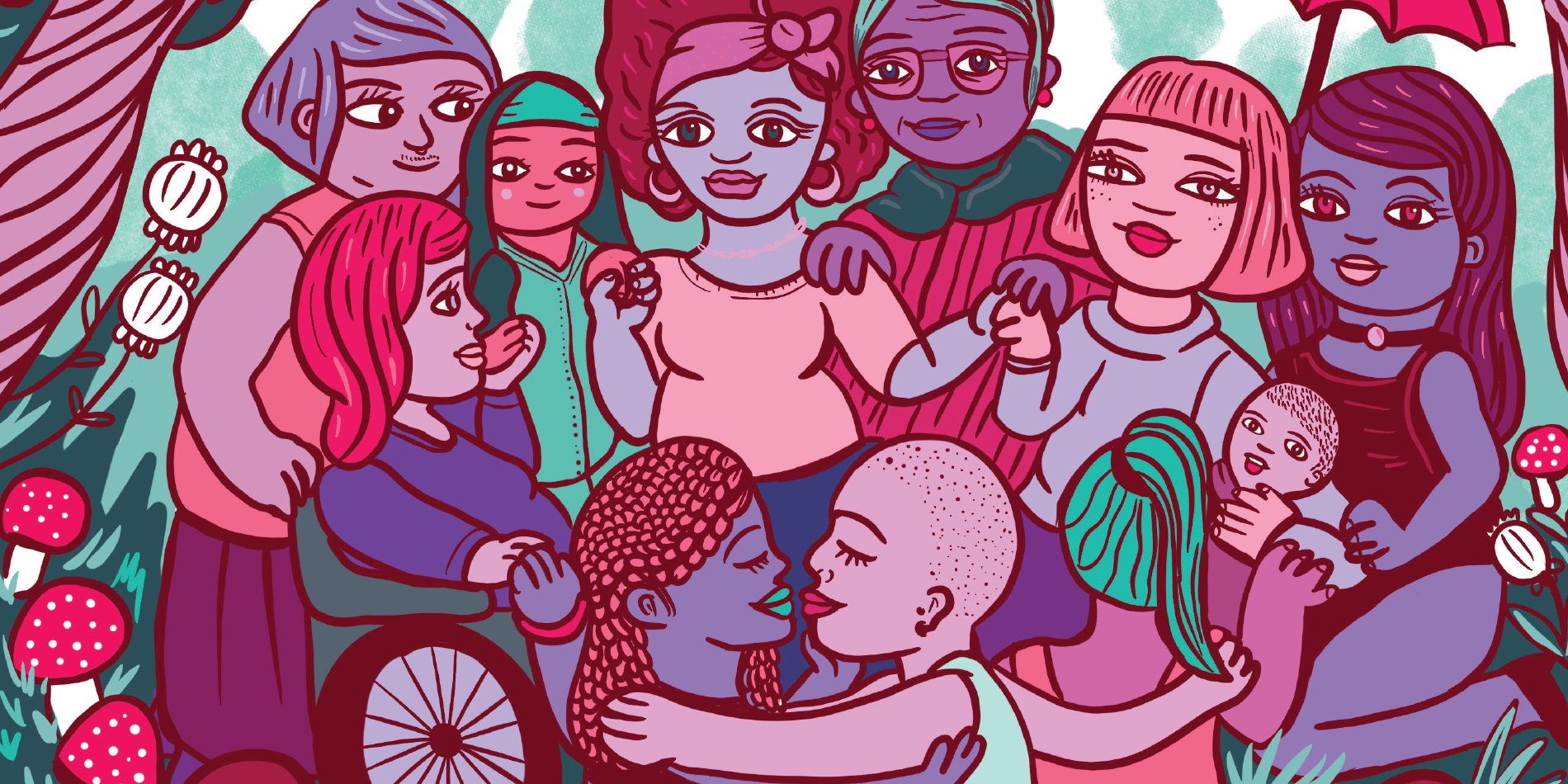 This is the cover for the 2023 Feminist Calendar. It shows a diverse group of people of all ages embracing and holding hands.