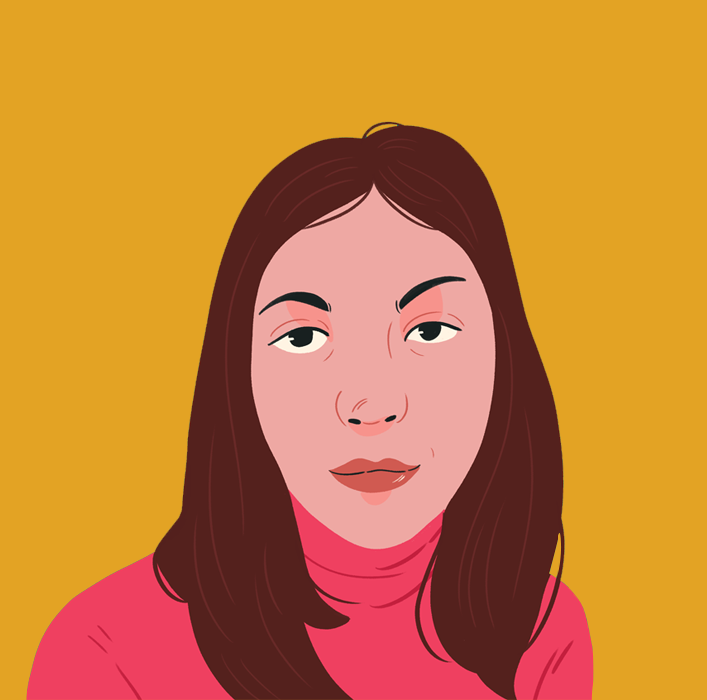 Illustration of two a pair of white-skinned people in glasses, to the left in the background is a mand and to the right at the forefront is a woman. The background is turquoise.