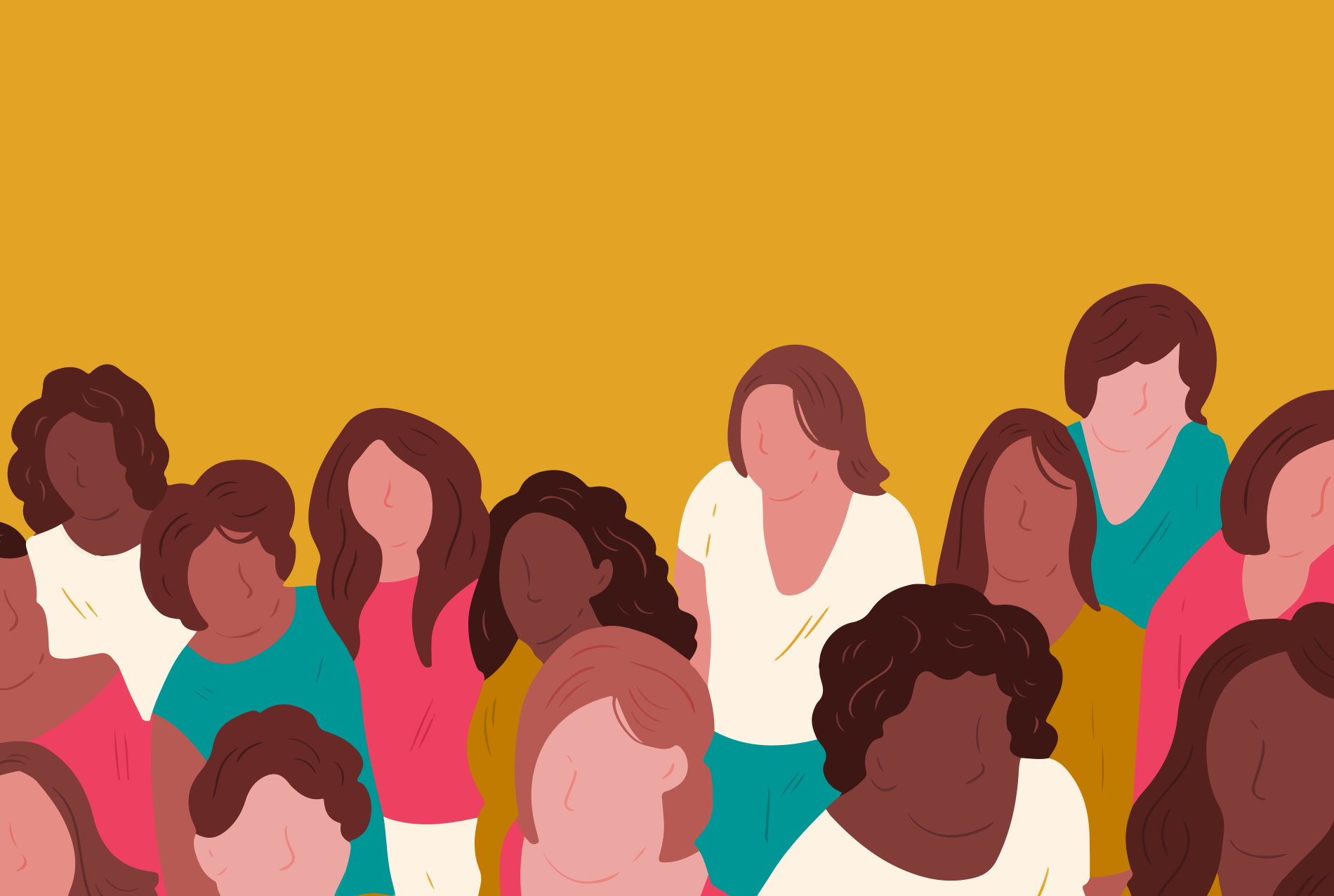 This image depicts seven faceless people standing together: one white person with a v-neck red shirt and semi-long chestnut hair, one Black person with curly short hair and a white shirt, one black person with long brown hair and a mustard shirt, one white person with short brown hair and a turquoise shirt, one brown person with long brown hair with a mustard shit, one white person with a white shirt, short brown hair, one white person with short dark brown hair and a red shirt.