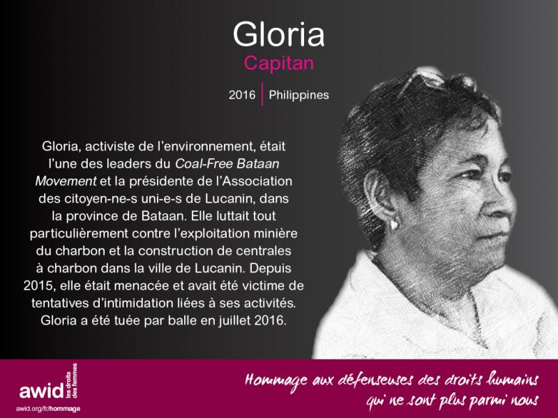 Puis, en 2016, elle commença à recevoir des visites menaçantes d’hommes non identifiés, l’avertissant qu’elle devait mettre un terme à ses actions contre le charbon, ou en subir les conséquences. Ce qu’elle refusa. En juillet de la même année, Gloria Capitan, mère de cinq enfants et grand-mère de 18 petits-enfants, propriétaire d’un bar karaoké de bord de route, fut abattue à l’arme à feu par des assaillants non identifiés, devant ses petits-enfants, sur son lieu de travail.