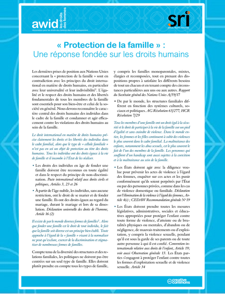 Les dernières prises de position aux Nations Unies concernant la « protection de la famille » sont en contradiction avec les principes du droit interna- tional en matière de droits humains, en particulier lité et le respect des droits humains et des libertés avec leur universalité et leur indivisibilité fondamentales de tous les membres de la famille sont essentiels pour son bien-être et celui de la so- ciété en général.