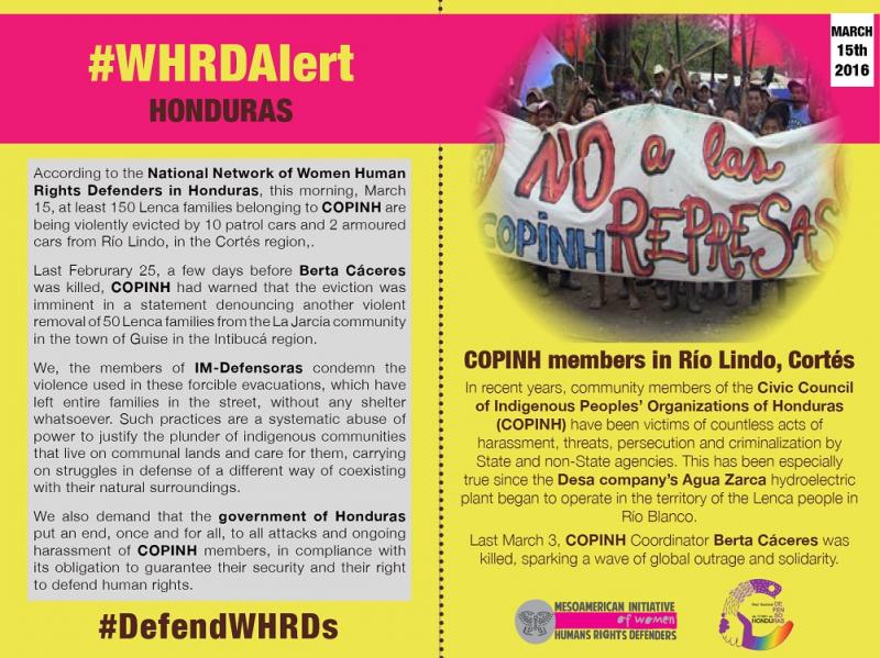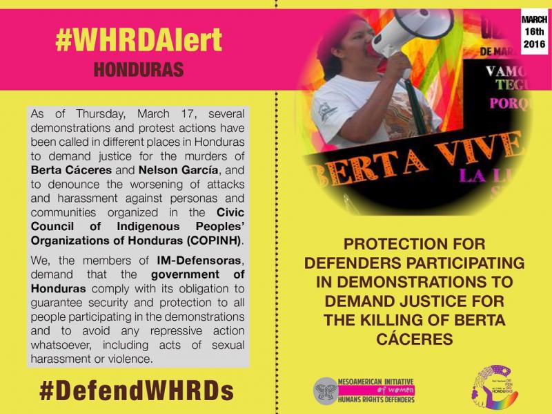 Mesoamerica, March 17, 2016 - The 691 women human rights defenders (WHRDs) from El Salvador, Guatemala, Honduras, Mexico and Nicaragua who make up the Mesoamerican Initiative of Women Human Rights Defenders (IM-Defensoras) demand that the Honduran government immediately fulfill its obligation to protect the life and integrity of human rights defenders.