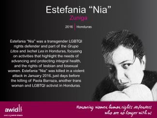 In our 2015 Online Tribute to Women Human Rights Defenders No Longer With Us we are commemorating four women from Sub-Saharan Africa, three of whom were murdered due to their work and/or who they were in their gender identity and sexual orientation. Their deaths highlight the violence LGBT persons often face in the region and across the globe. Please join AWID in honoring these women, their activism and legacy by sharing the memes below with your colleagues, networks and friends and by using the hashtags #WHRDTribute and #16Days.