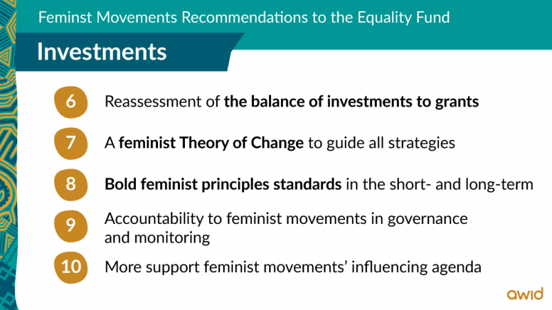 • Build in accountability to feminist movements in investment governance and monitoring