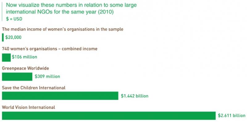 • The current spotlight on women and girls has had relatively little impact on improving the funding situation for a large majority of women’s organizations around the world. In 2010, the median annual income of over 740 women’s organizations around the world was USD 20,000.